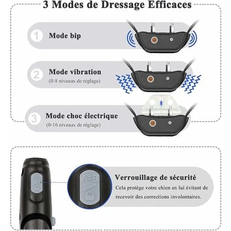 Questo collare di addestramento per cani ha 3 modalità attive: suono standard, vibrazione (regolabile da 0 a 8) e shock (regolabile da da 0 a 16 premendo il pulsante su/giù). La maggior parte dei cattivi comportamenti del cane possono essere corretti o semplicemente insegnati i comandi di obbedienza di base.